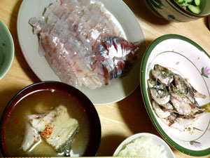 早速、昨日の我が家の食卓は、刺身、あら汁、バター焼き